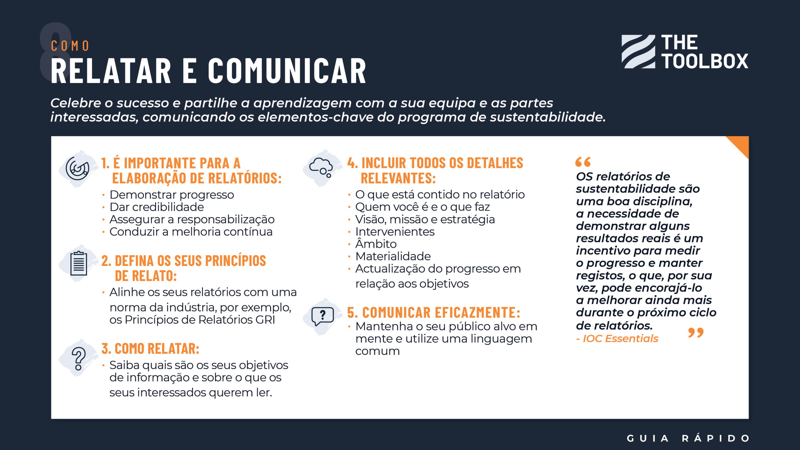 O passo final no processo de estabelecimento de um programa de sustentabilidade é relatar e comunicar. As ferramentas neste módulo irão ajudá-lo a se preparar para o processo de relatórios, considerar o que incluir e como se comunicar de forma eficaz.
