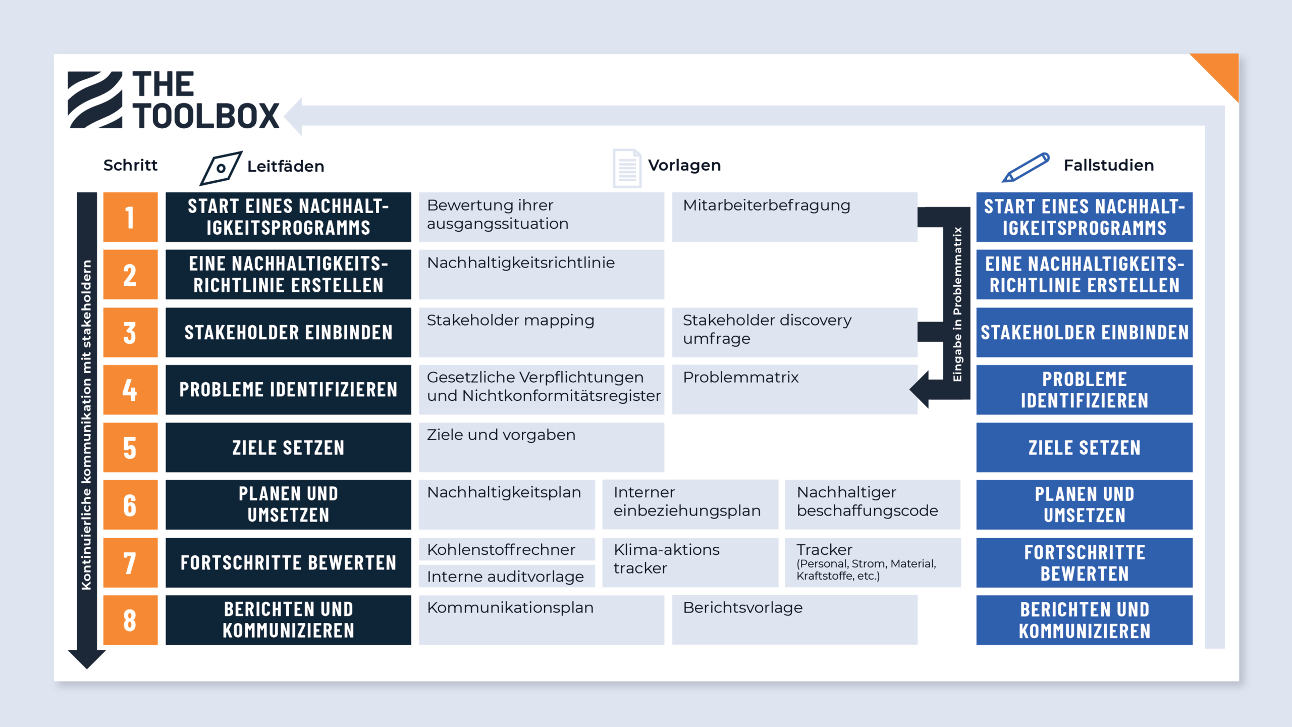 Jeder Schritt enthält eine Kurzanleitung, einen Leitfaden, Fallstudien und Vorlagen. Sie können Teile der Toolbox in verschiedenen Phasen Ihres Nachhaltigkeitsplans verwenden oder den gesamten Prozess durchlaufen. Wie auch immer Sie sich für die Arbeit mit der Toolbox entscheiden, das Toolbox-Team bietet Ihnen einen persönlichen Support is provided by The Toolbox team to help you make the most out of the tools. For more advanced support or bespoke workshops for your organization, The Toolbox Accelerator allows you to devise a project zu entwickeln, das Ihnen zusätzliche Unterstützung bietet, damit Sie Ihre Barrieren überwinden und gleichzeitig einen Mehrwert für die Toolbox-Community schaffen.