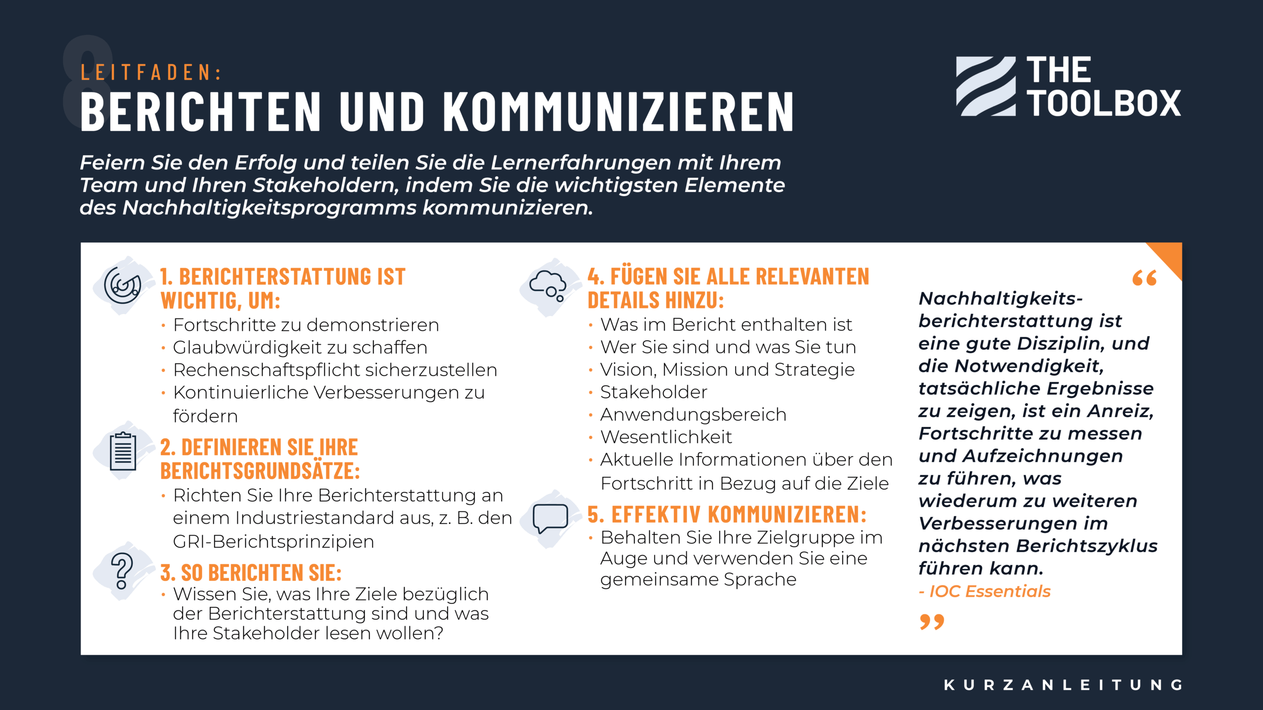 Lesen Sie den Leitfaden durch, um die Schritte zur Berichterstattung und Kommunikation Ihres Nachhaltigkeitsprogramms zu verstehen.