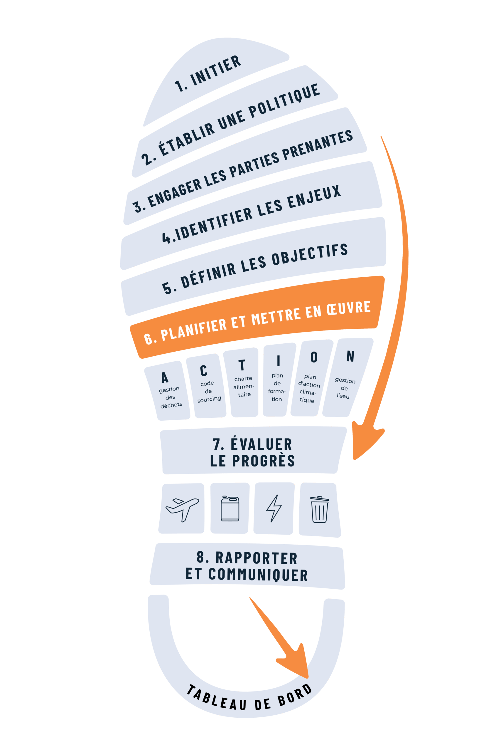 La sixième étape du processus consiste à créer une stratégie d'actions pour atteindre chacun de vos objectifs. Les outils de ce module vous aideront à identifier les outils et les ressources nécessaires à l'exécution de vos plans. Utilisez le Template de Stratégie de Développement Durable pour donner un cadre à la description de vos nouvelles procédures, rôles et responsabilités.