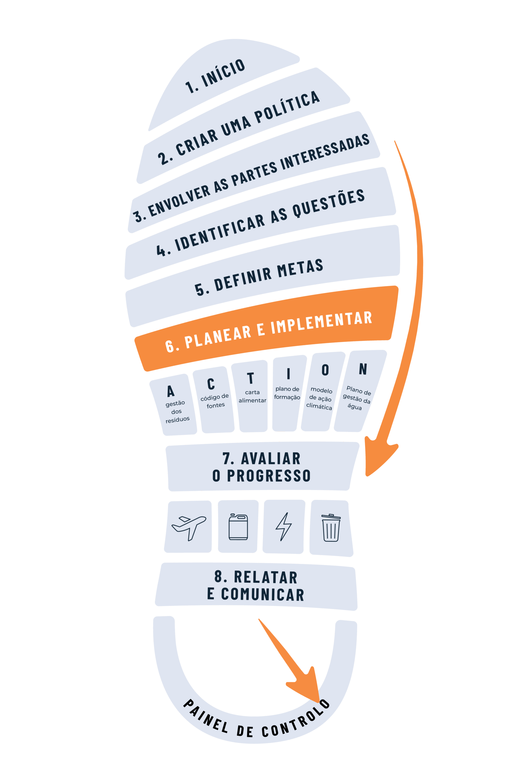 O sexto passo no processo é criar um plano de ação para abordar cada uma das suas metas. As ferramentas neste módulo irão ajudá-lo a identificar ferramentas e recursos para executar os seus planos. Utilize o Modelo de Plano de Sustentabilidade para fornecer uma estrutura para descrever os seus novos procedimentos, funções e responsabilidades.